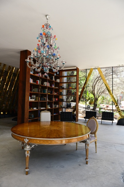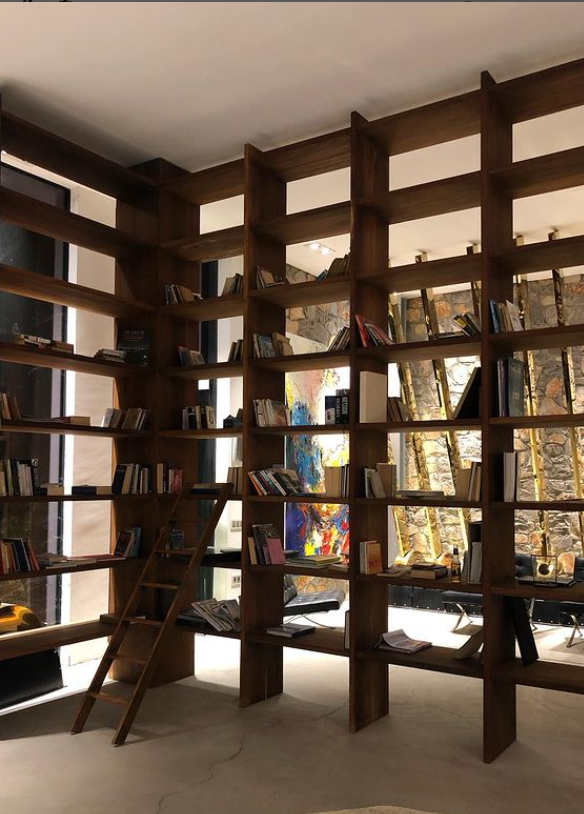Meticulously chosen books in ceiling-high monumental bookshelves in the core of transparent glass cubes clashed around exquisite puristic furniture. In the spine of the library, the stone wall is enriched with contemporary art pieces, putting a contemporary twist on tradition.